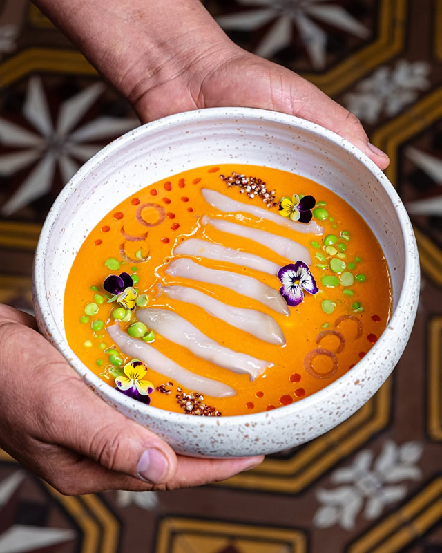 Para el comienzo bien vale un trago a cargo del bartender Aldo Collantes. Aquí la primera recomendación es el coctel Huayro a base de vodka, sachaculantro, yacón y tónica, decorado con una fresca lonja de la papa. Para los fans del Negroni, indispensable la versión que lleva muña negra; y el Flamenco con pisco de uva Italia, cushuro y sandía.