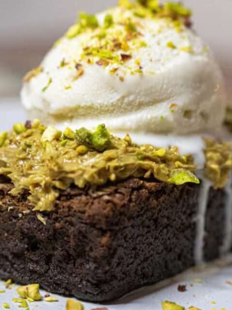 Brownie relleno con el chocolate tipo Dubai con pistachos