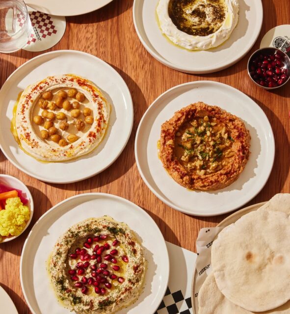 Hummus, baba ganoush, muhammara, platos en Ezzem, acompañados con pan pita